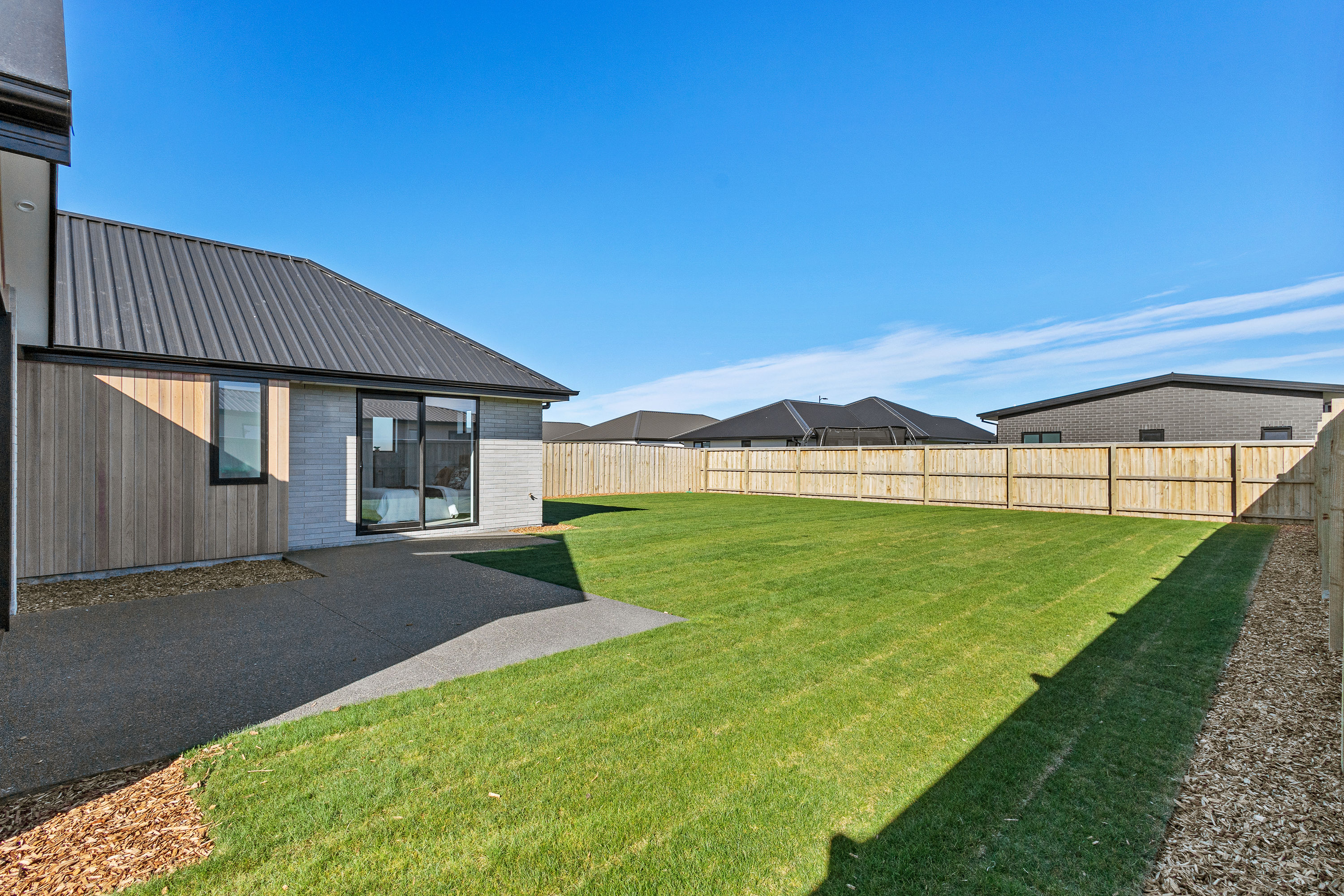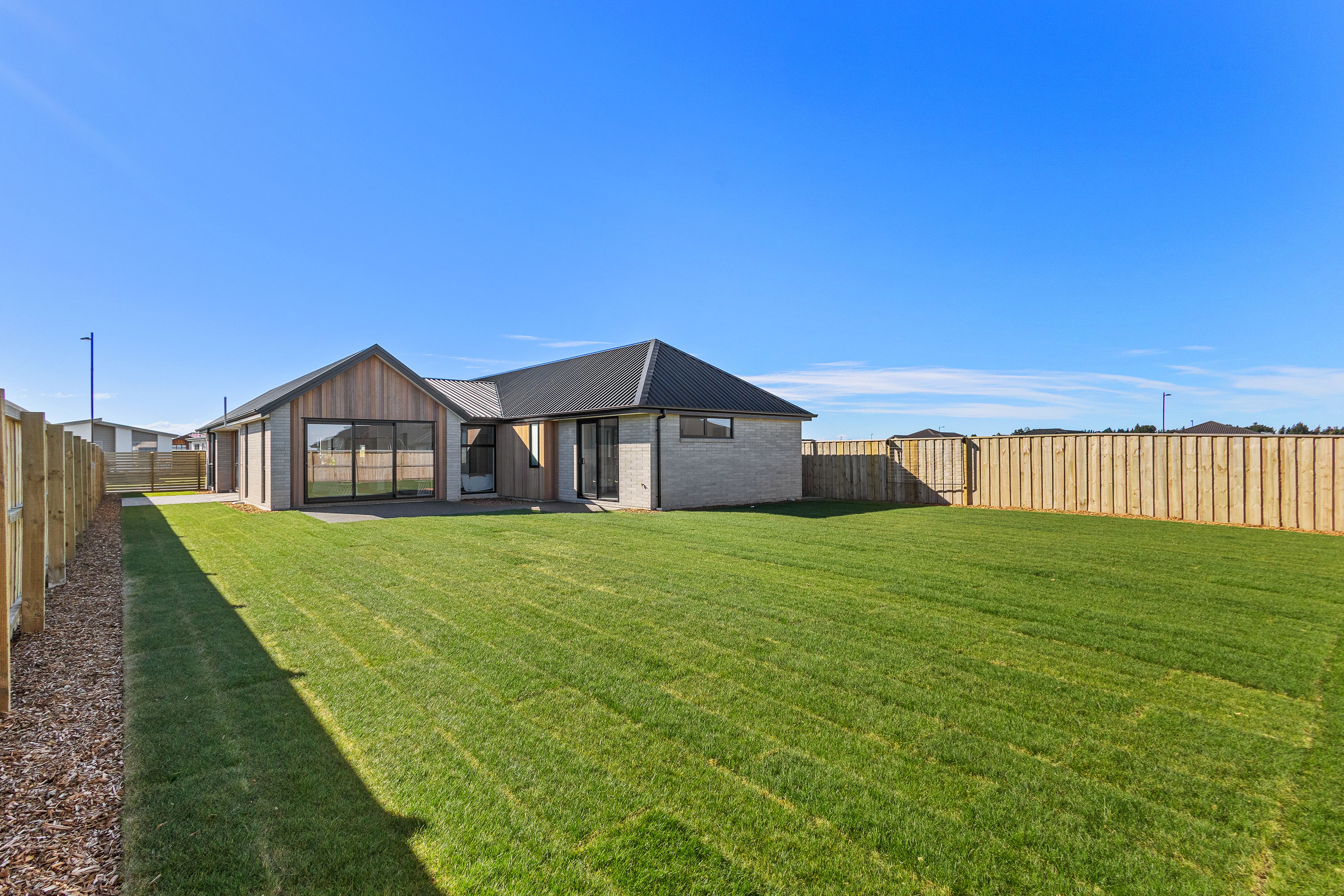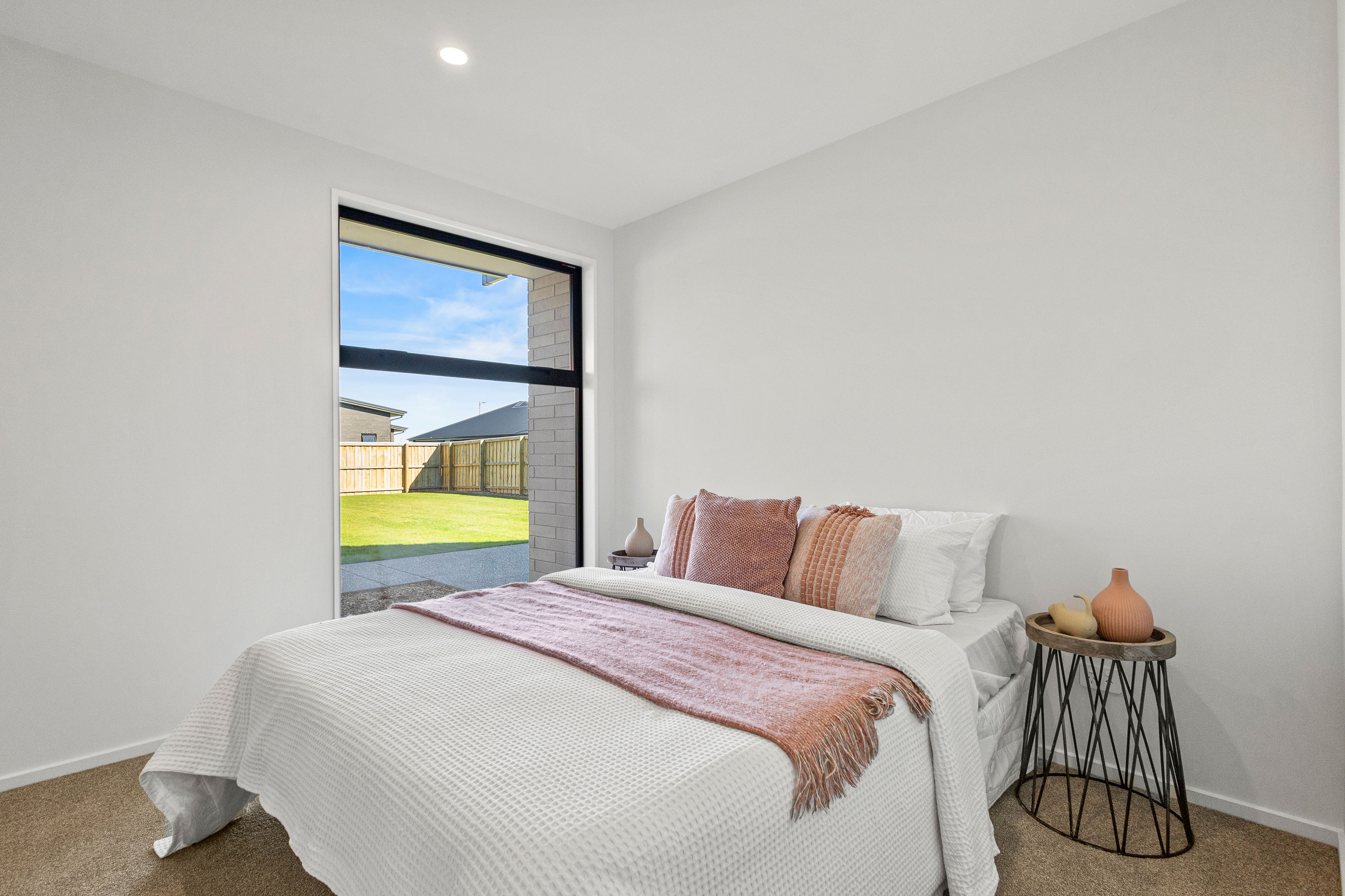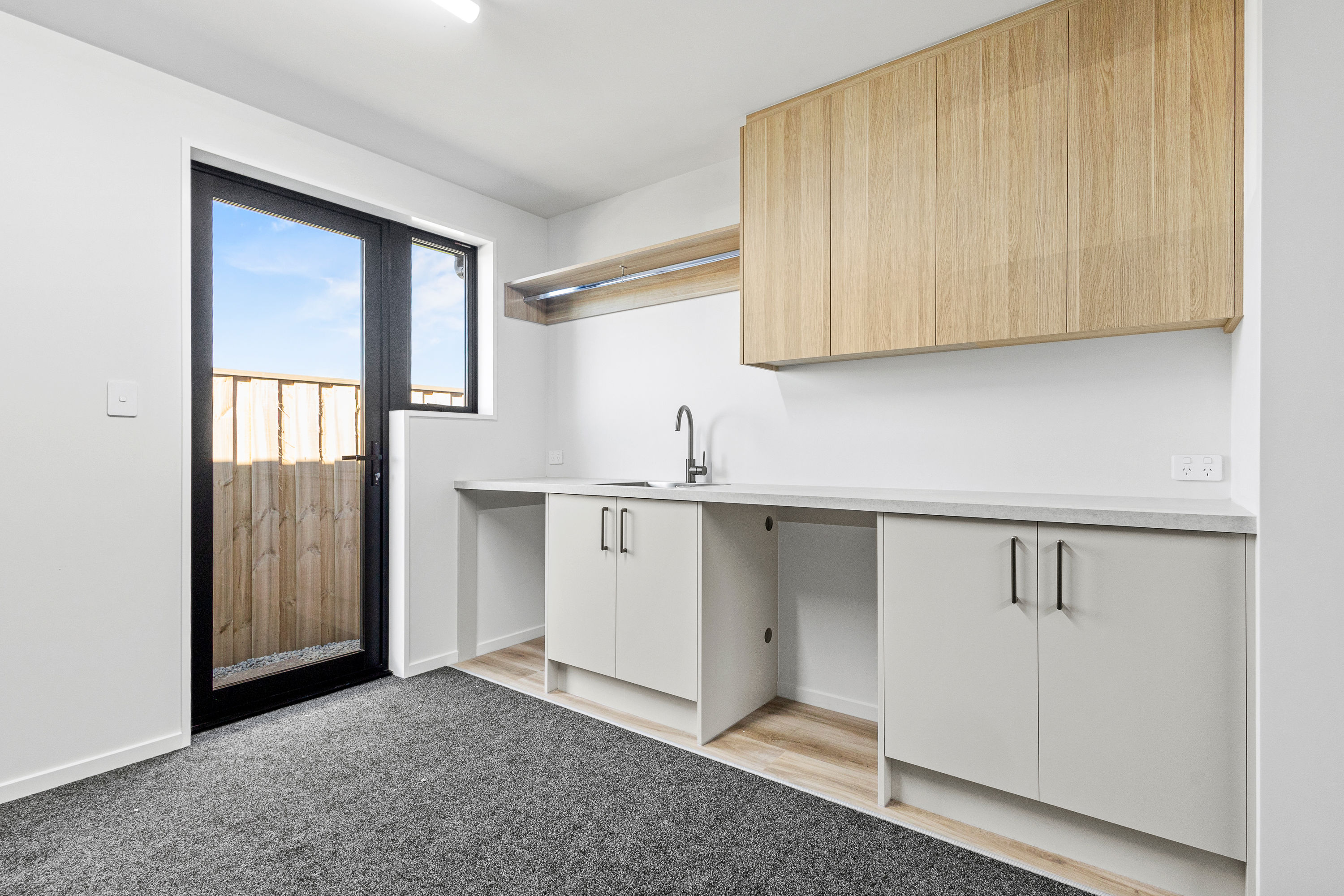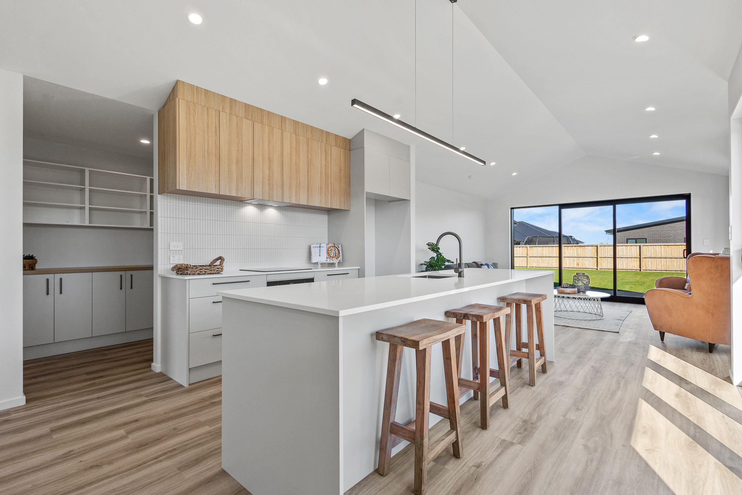 Practical touches have been carefully considered: a generous walk-in pantry to keep the kitchen tidy, a spacious fully fitted laundry space with outdoor access, and a double garage with carpet to keep life organised. Outside, the landscaped section offers plenty of space to add your own touches – a vegetable garden, a trampoline, or simply a sunny spot to sit and relax.