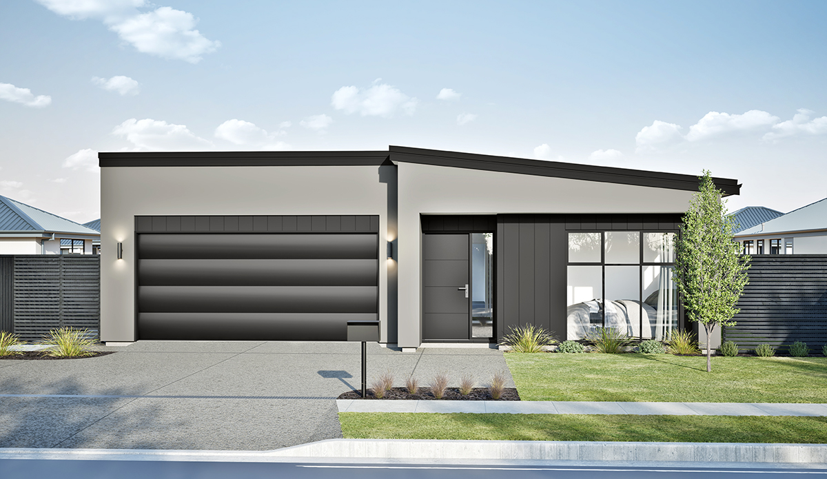 Cladding: Resene Rockcote plaster & Linea Oblique weatherboard (Resene Quarter Stonehenge & Dulux Stony River Half)