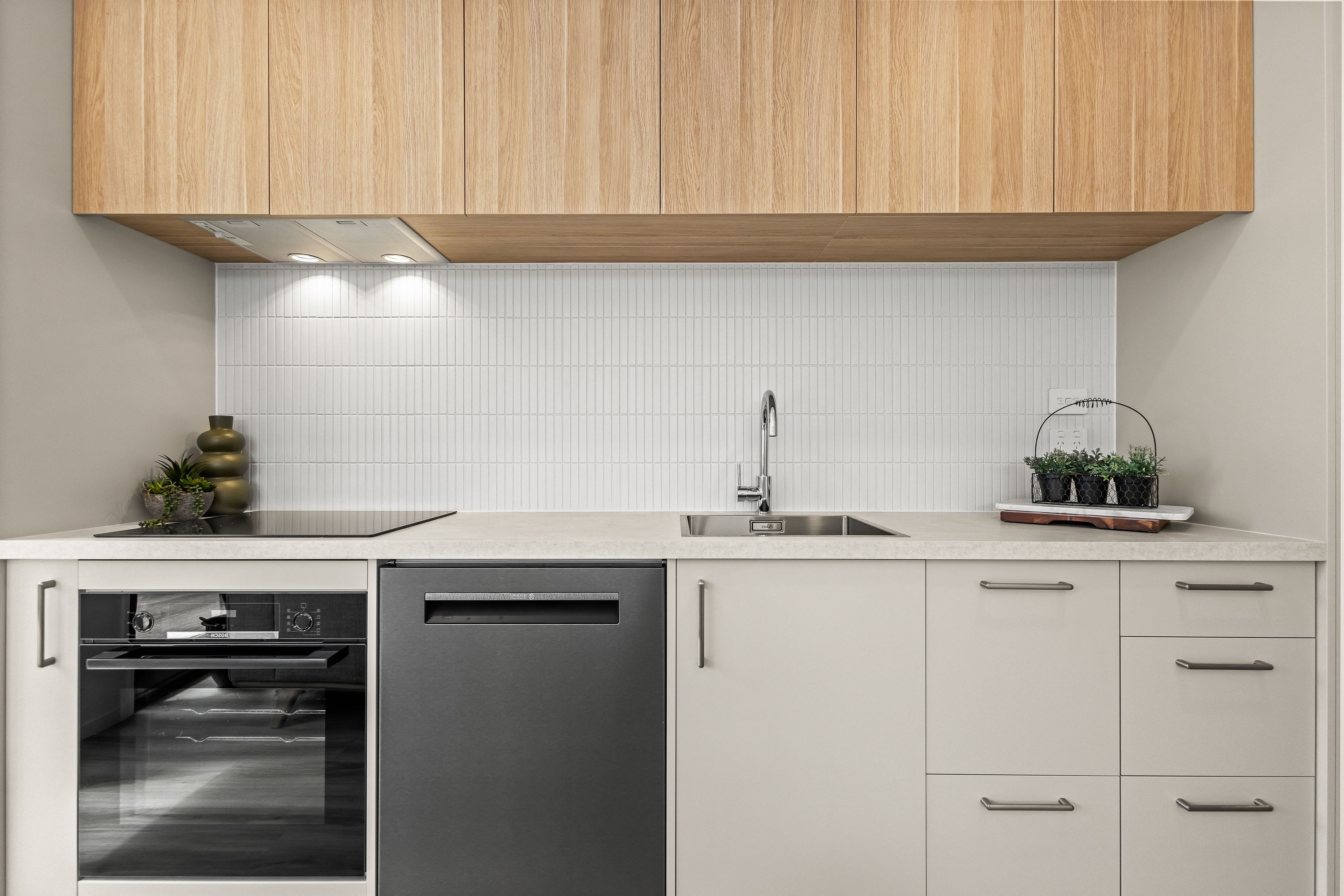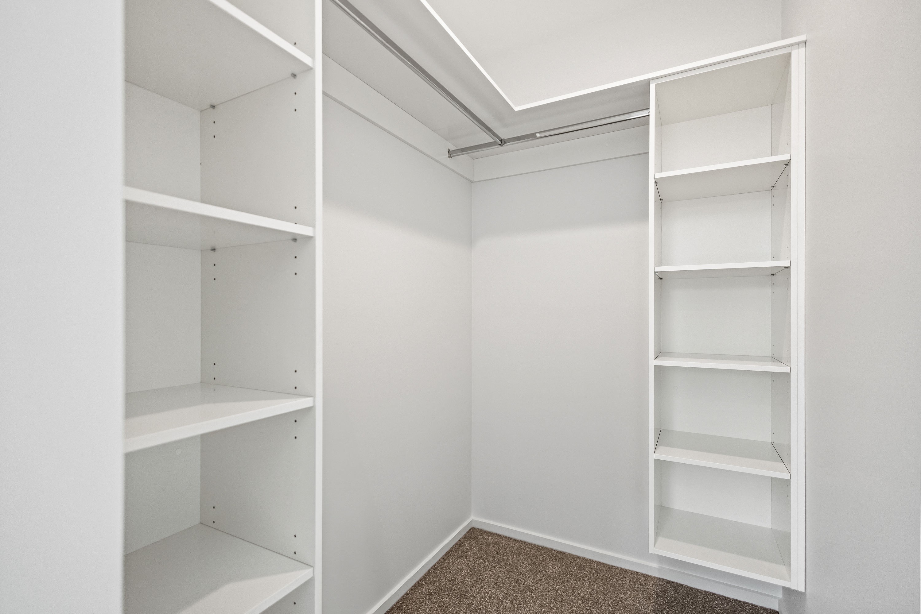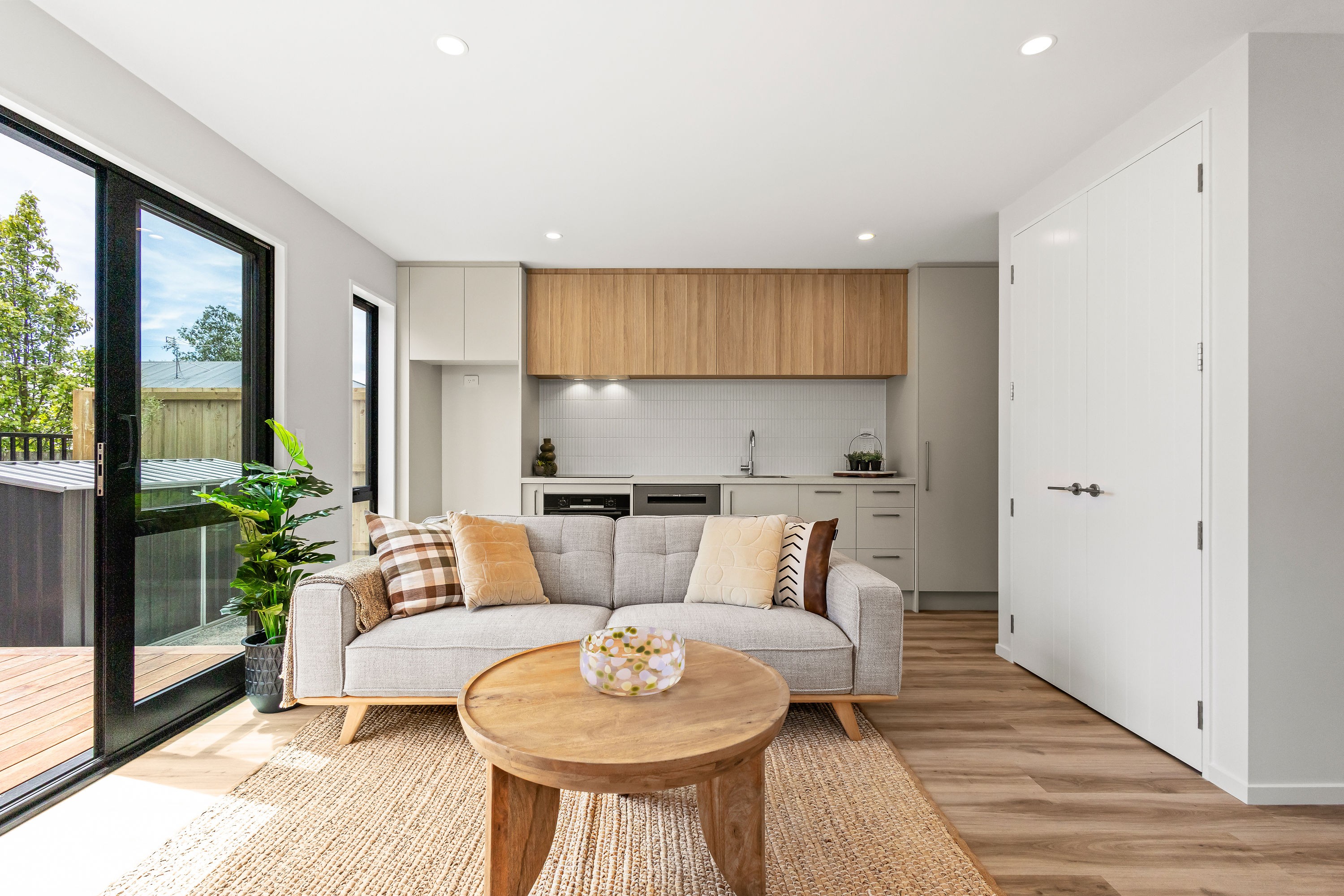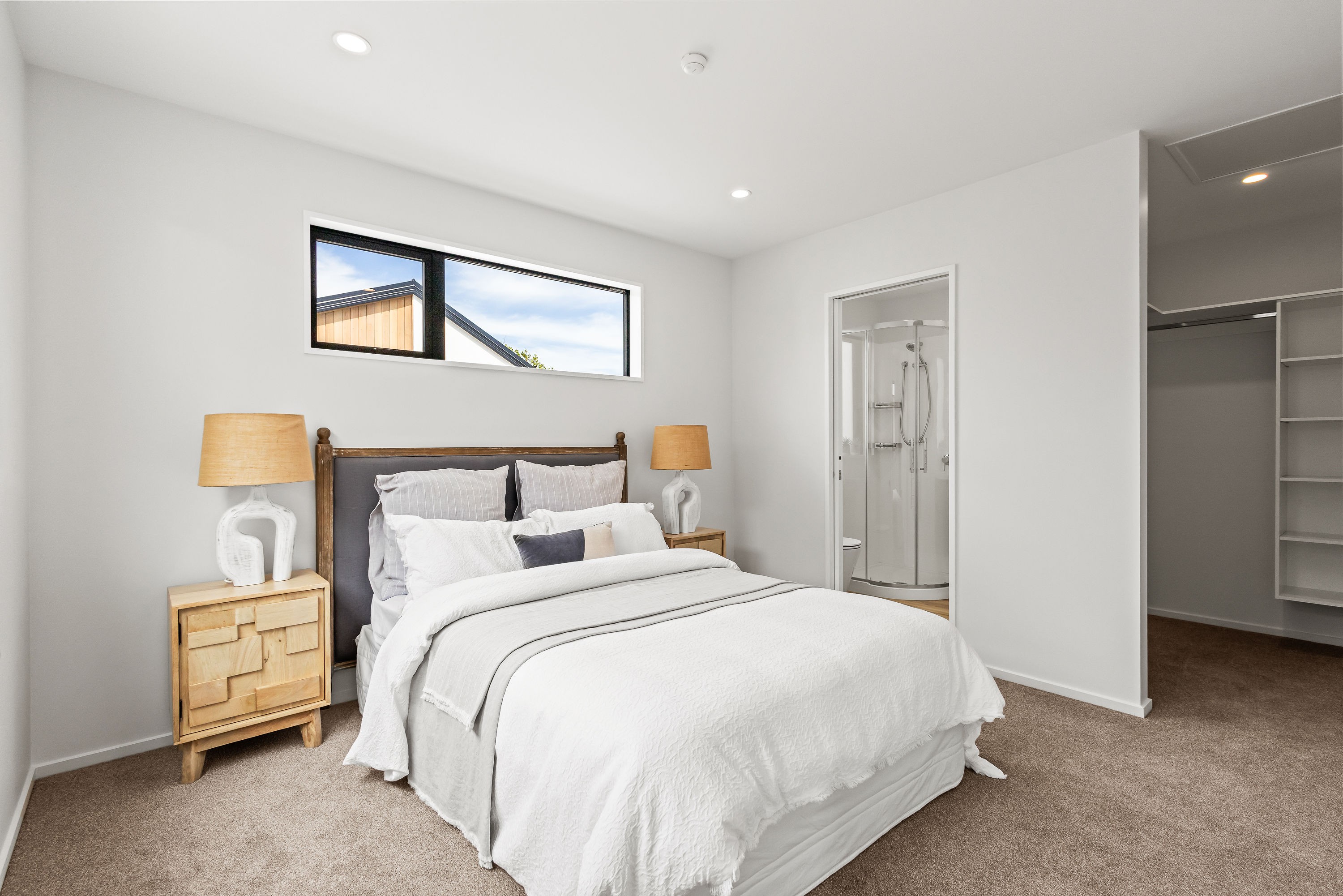 The designer kitchen features Bosch appliances and quality finishes, complemented by streamlined built-in storage. Vinyl plank flooring, plush Godfrey Hirst carpet, and a fresh Manorburn Half and Okarito palette give the home a warm, contemporary feel.