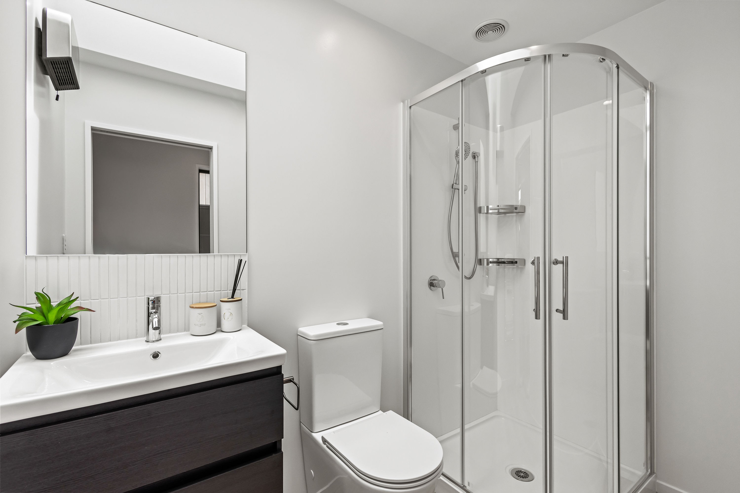 Two beautifully appointed bathrooms include charred oak vanities, Uno chrome tapware, heated towel rails, and sleek corner showers.