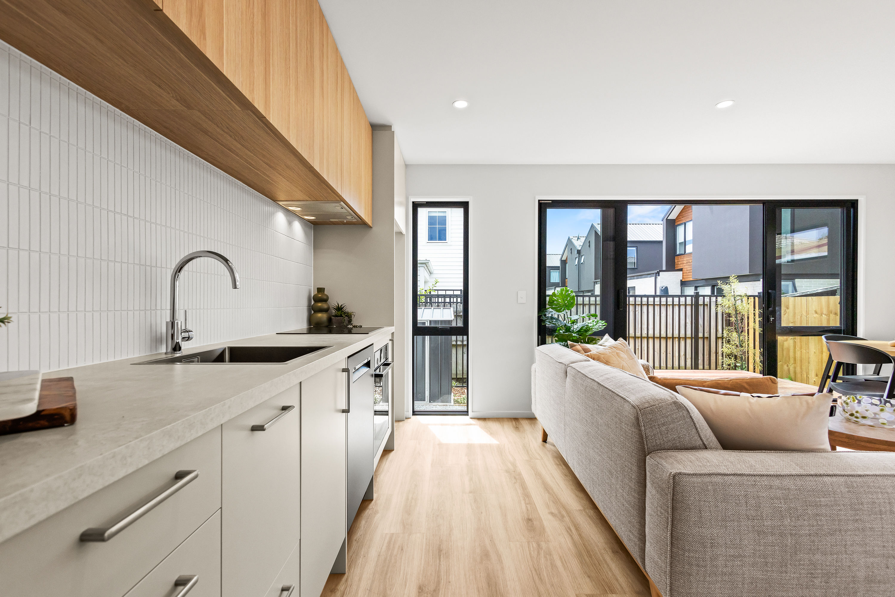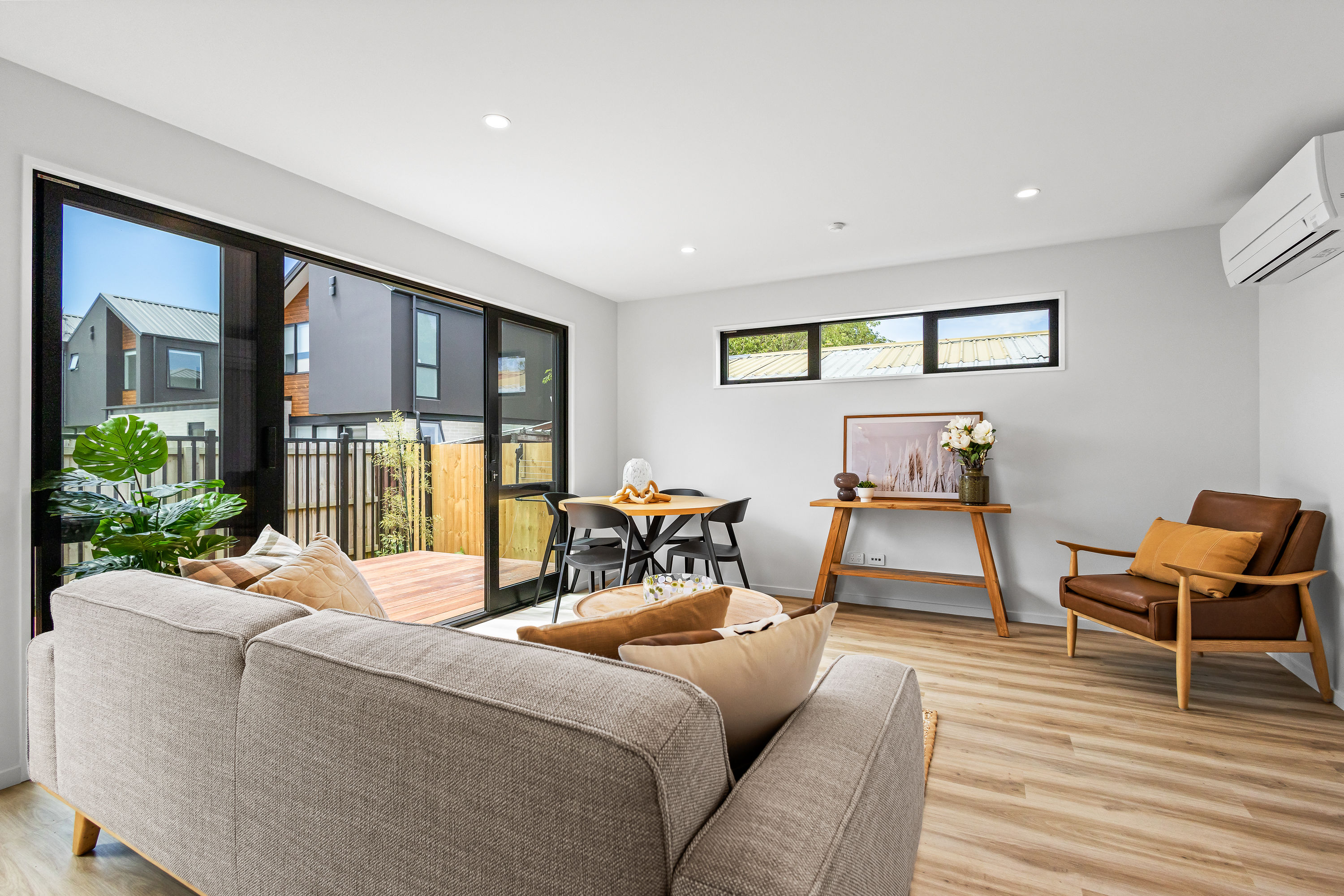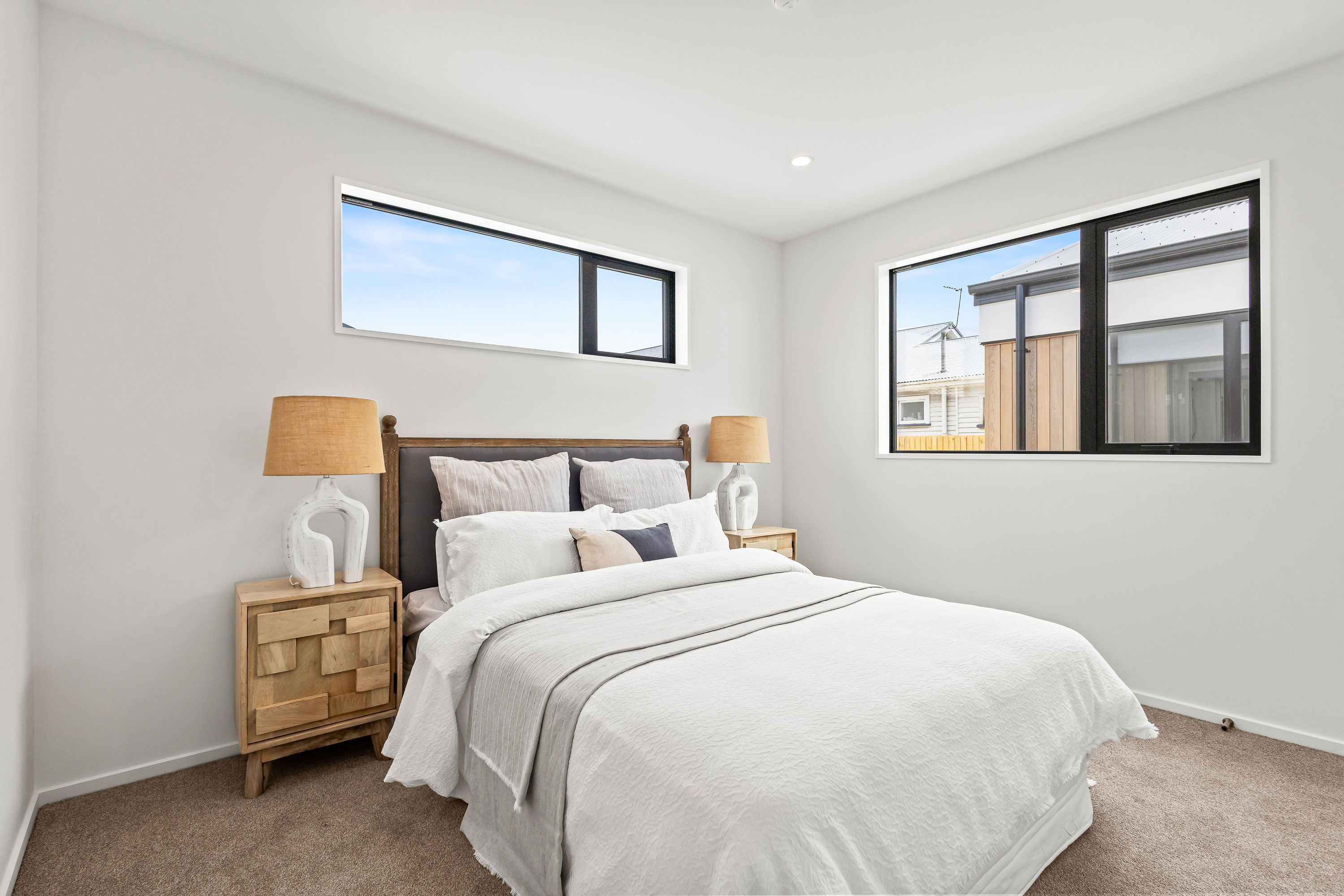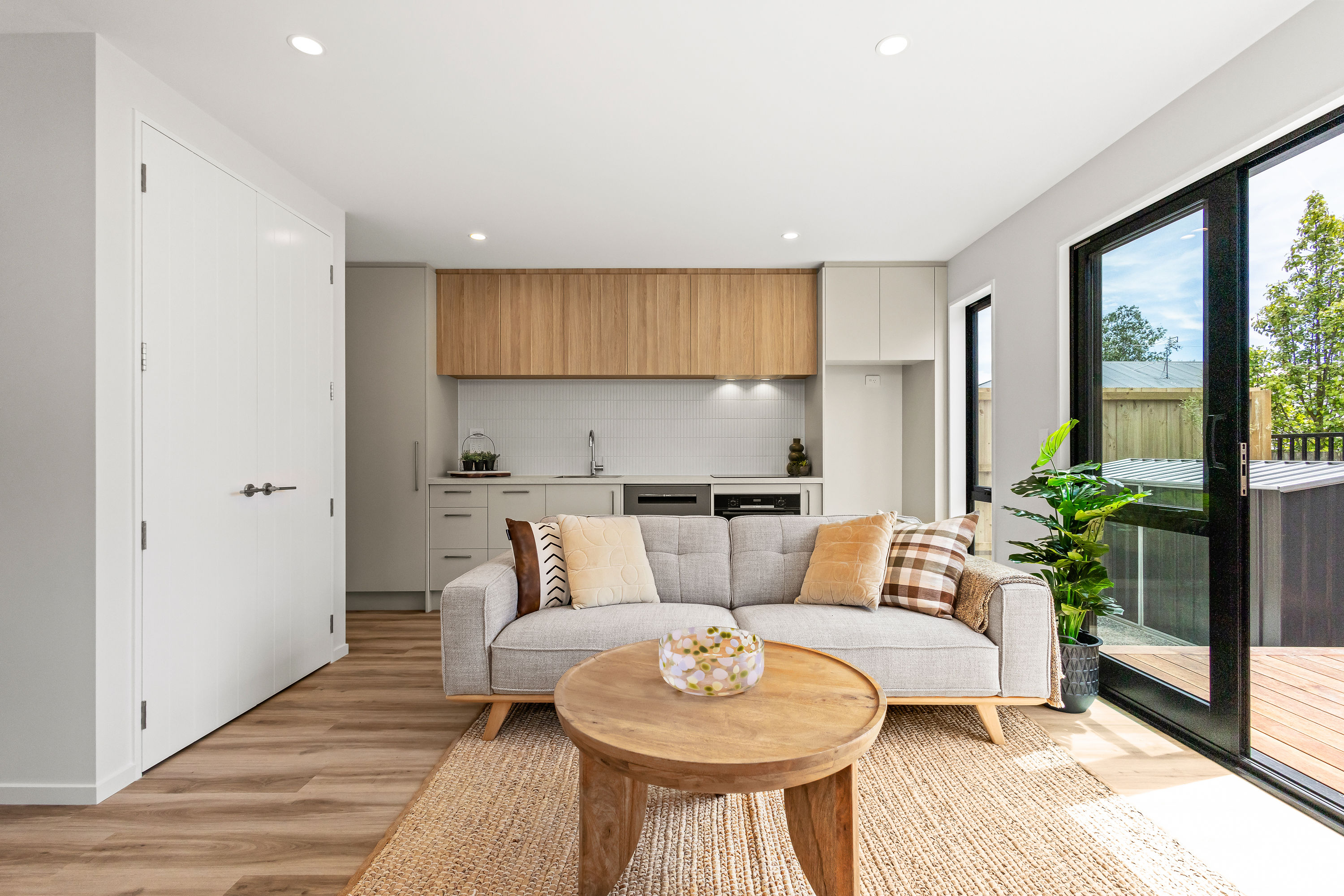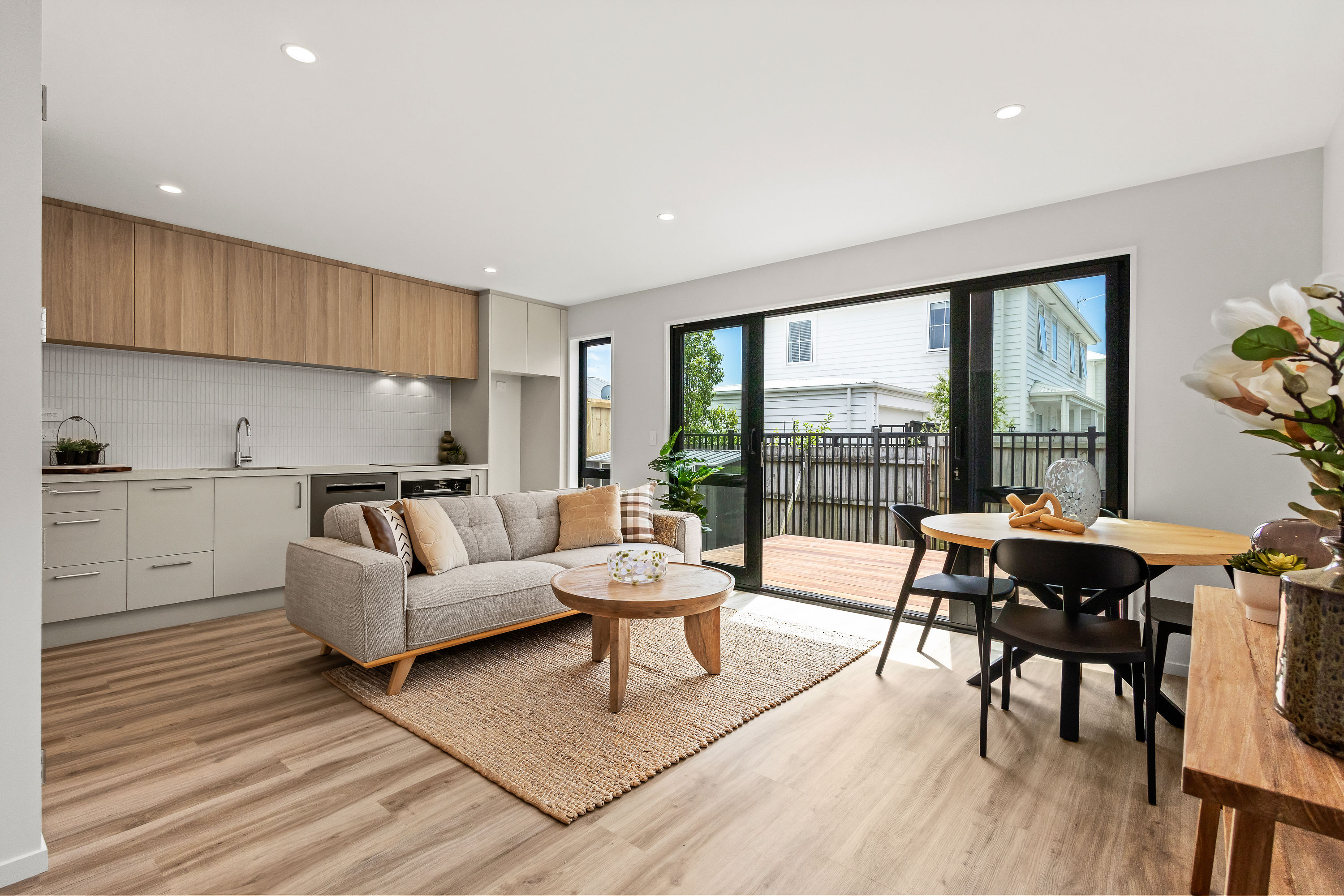 From the moment you arrive, the striking cedar and insulated Plaster façade sets a warm, welcoming tone. Clean gable lines, thermally-broken joinery in bold black, and a cohesive palette of natural textures create a home that is both elegant and enduring. Step inside and you’re greeted by a sun-filled open-plan living space flowing seamlessly to the private north-facing deck—ideal for relaxed entertaining or peaceful morning coffee.
