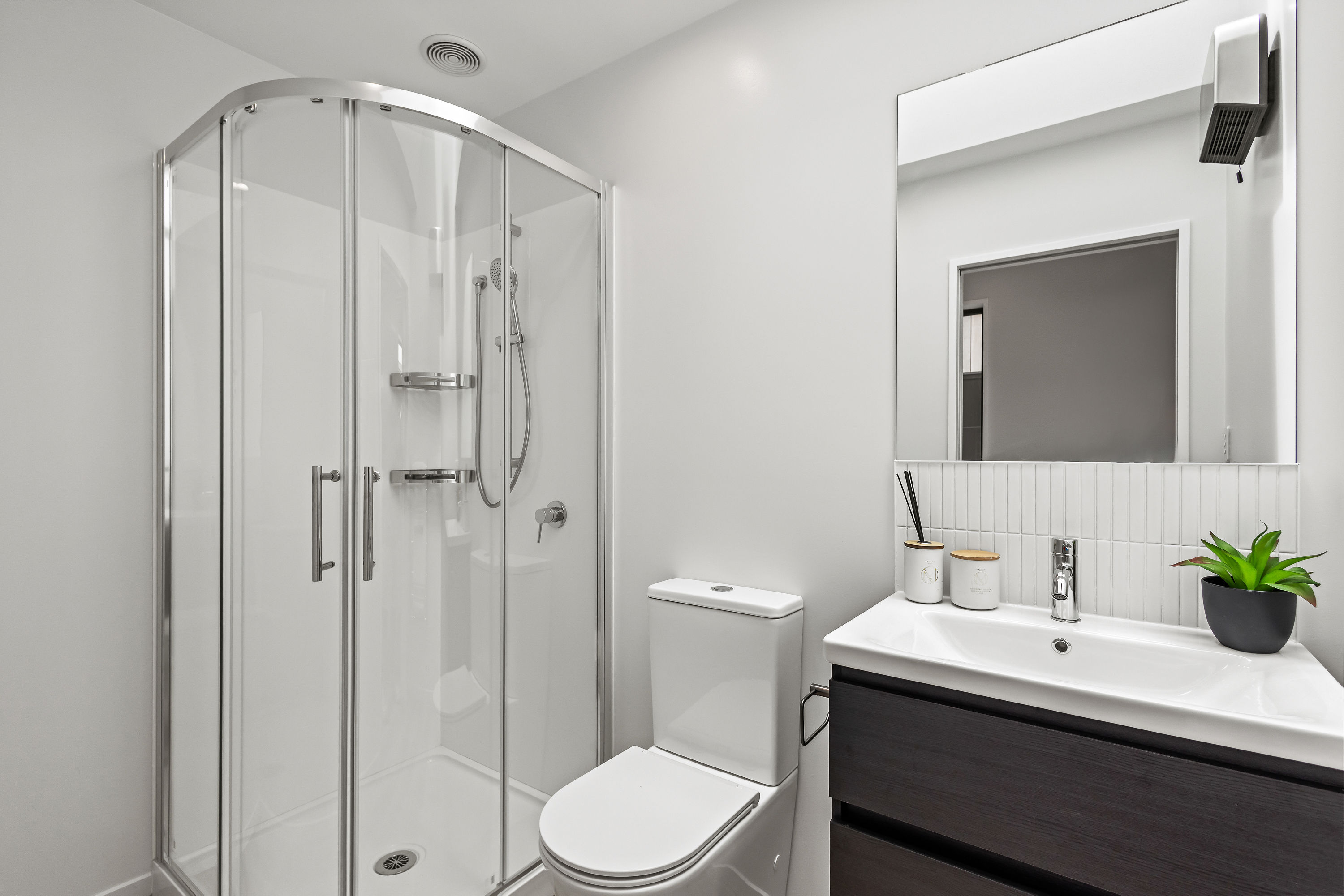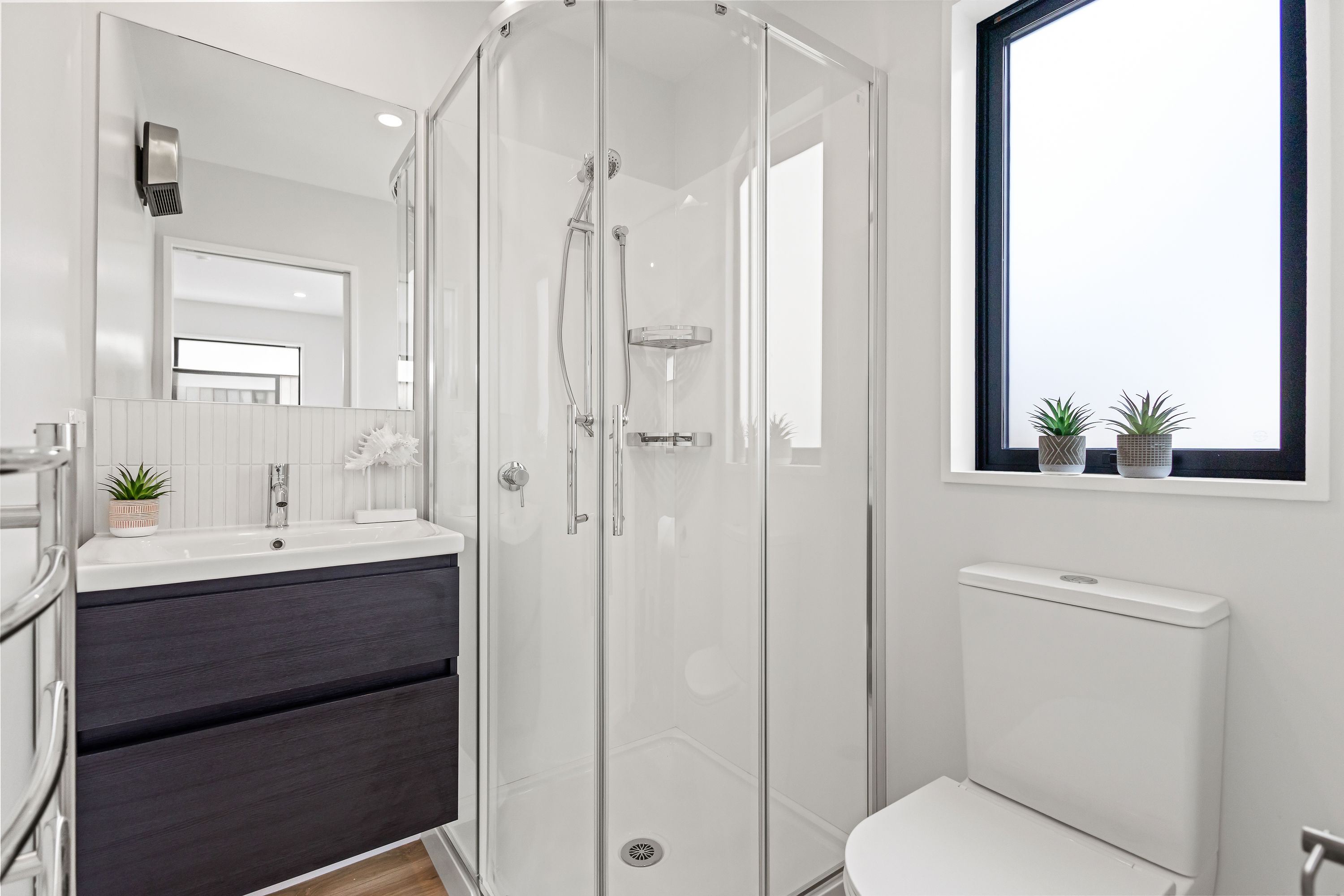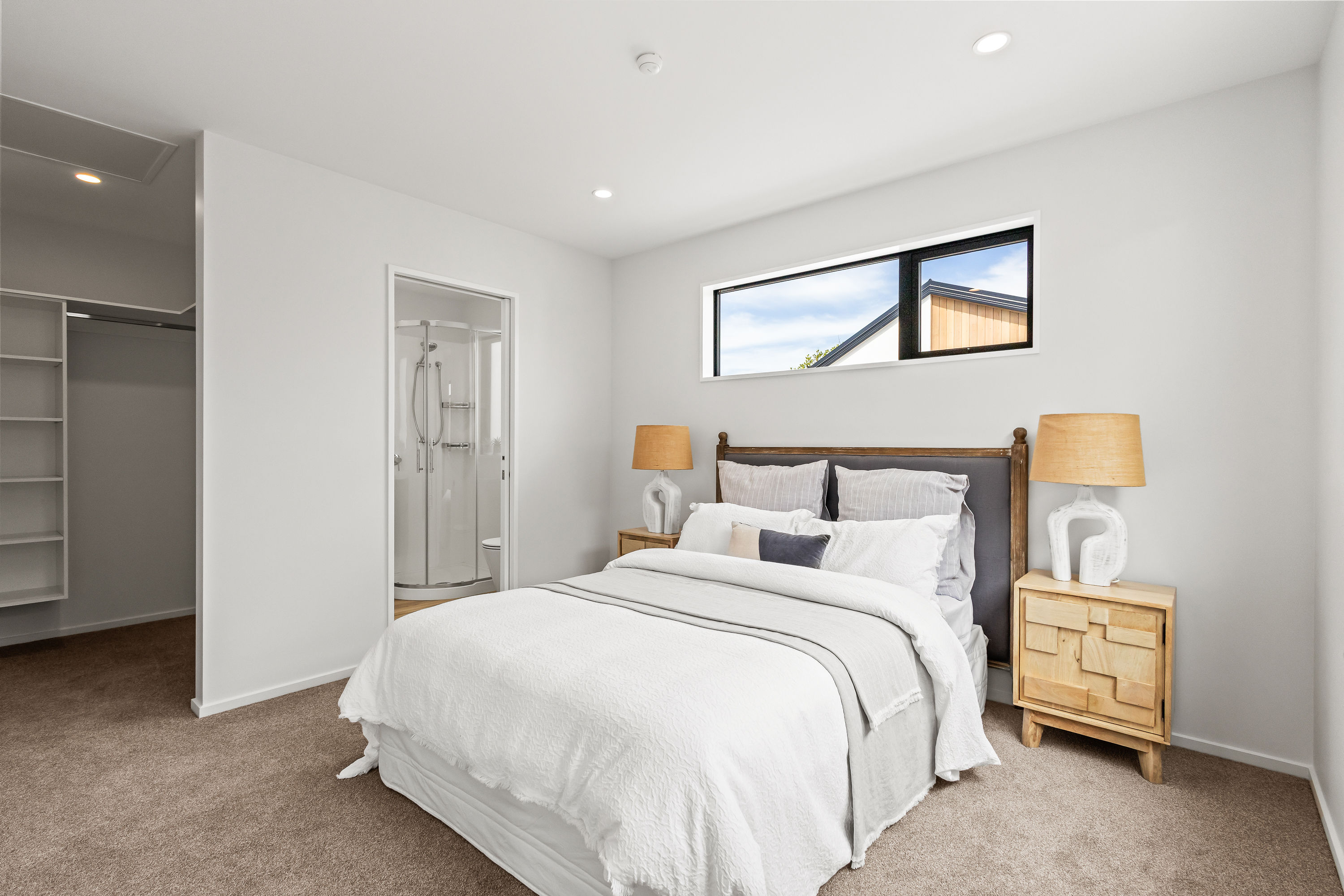 Comfort continues throughout with vinyl plank flooring, plush Godfrey Hirst carpet in the bedrooms, and a crisp interior palette of Manorburn Half walls and Okarito ceilings. The home includes a full bathroom as well as an ensuite with charred oak double drawer vanities, quality Uno chrome tapware, heated towel rails, and sleek corner showers.