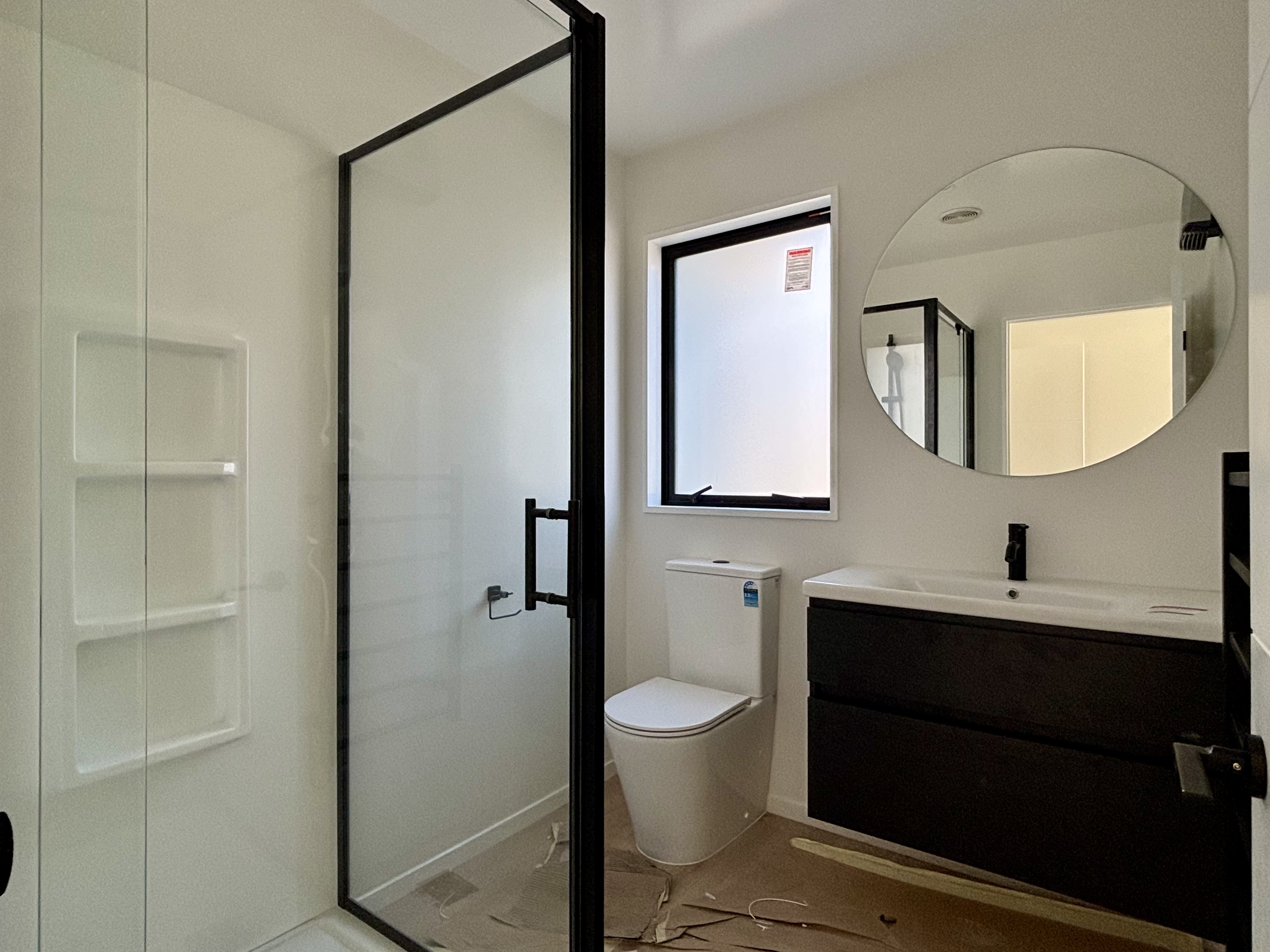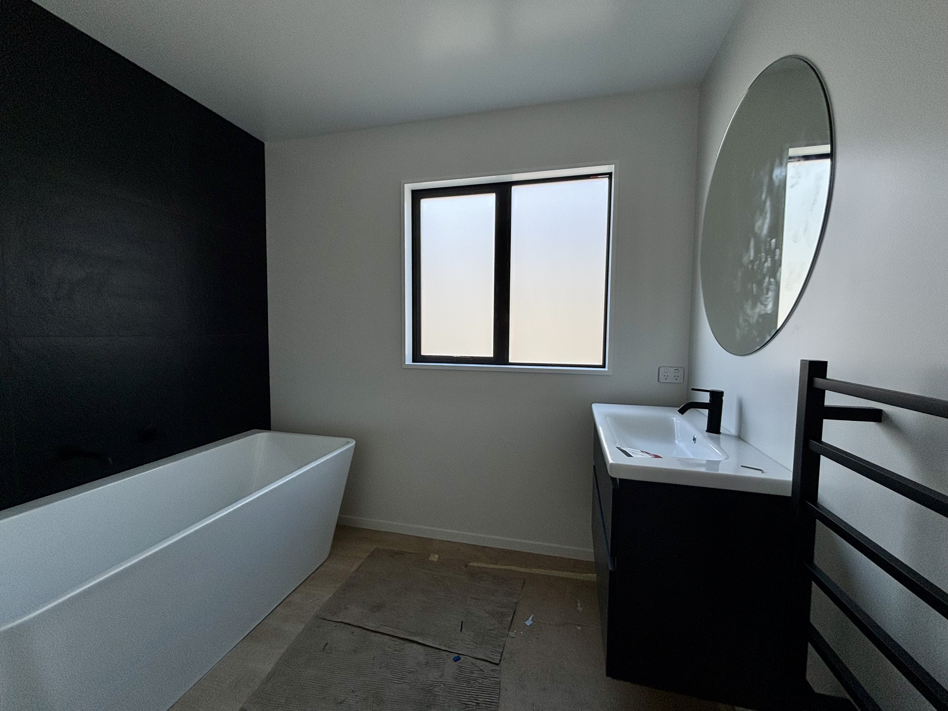 The spacious three-bedroom layout includes a master suite with walk-in robe and stylish ensuite, two additional double bedrooms with wardrobes, and a well-appointed family bathroom with Indus back-to-wall bath, tiled splashbacks, and black tapware and fittings throughout.