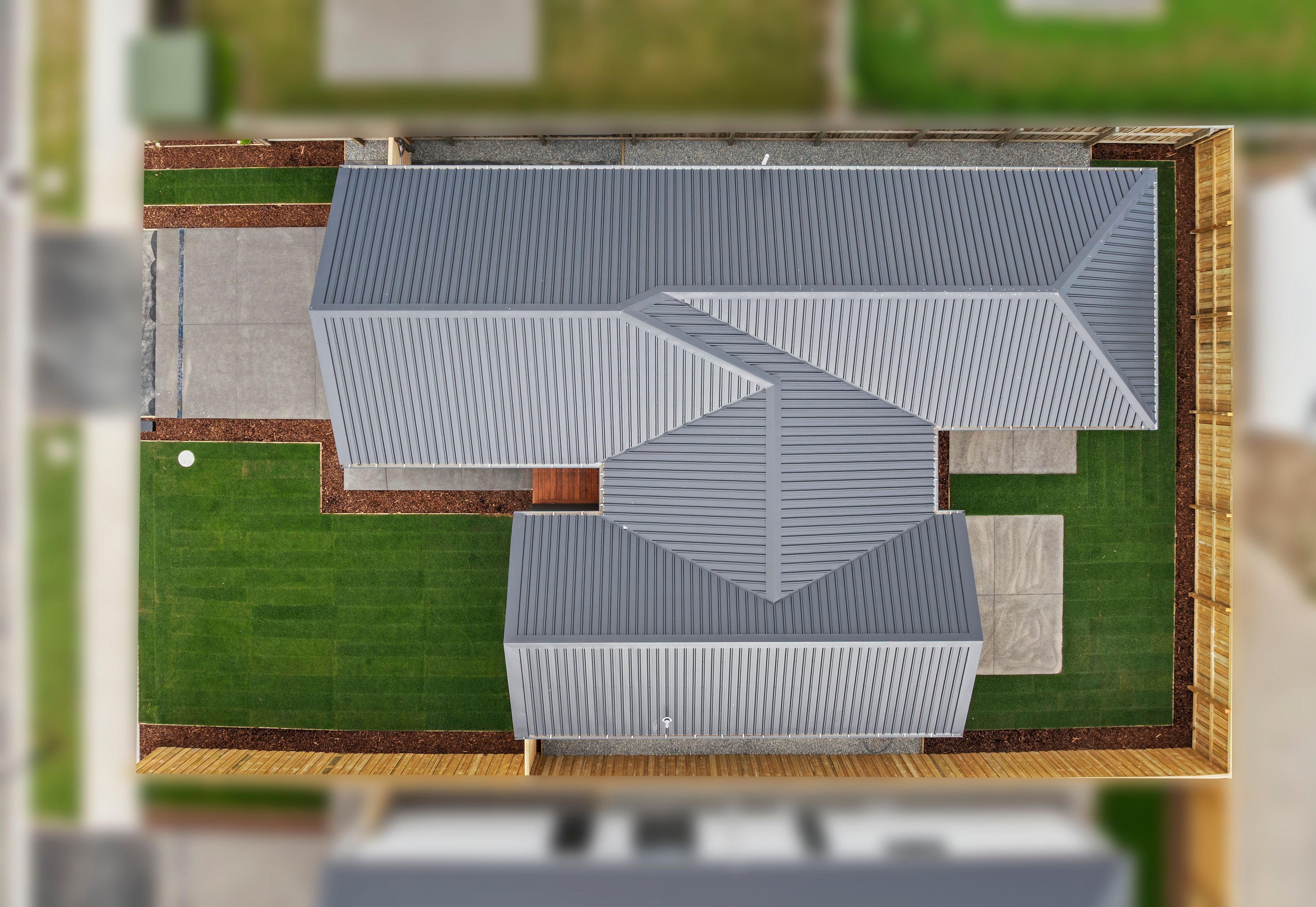 Step inside to a light-filled open-plan living space, complete with scissor-truss ceilings for extra height and a sense of spaciousness. The sleek kitchen features Melteca Silvered Ash and Bullet Organic cabinetry, Uniquartz White Ice benchtops, and brushed anthracite hardware, paired with a striking Sidewalk Grey tiled splashback.